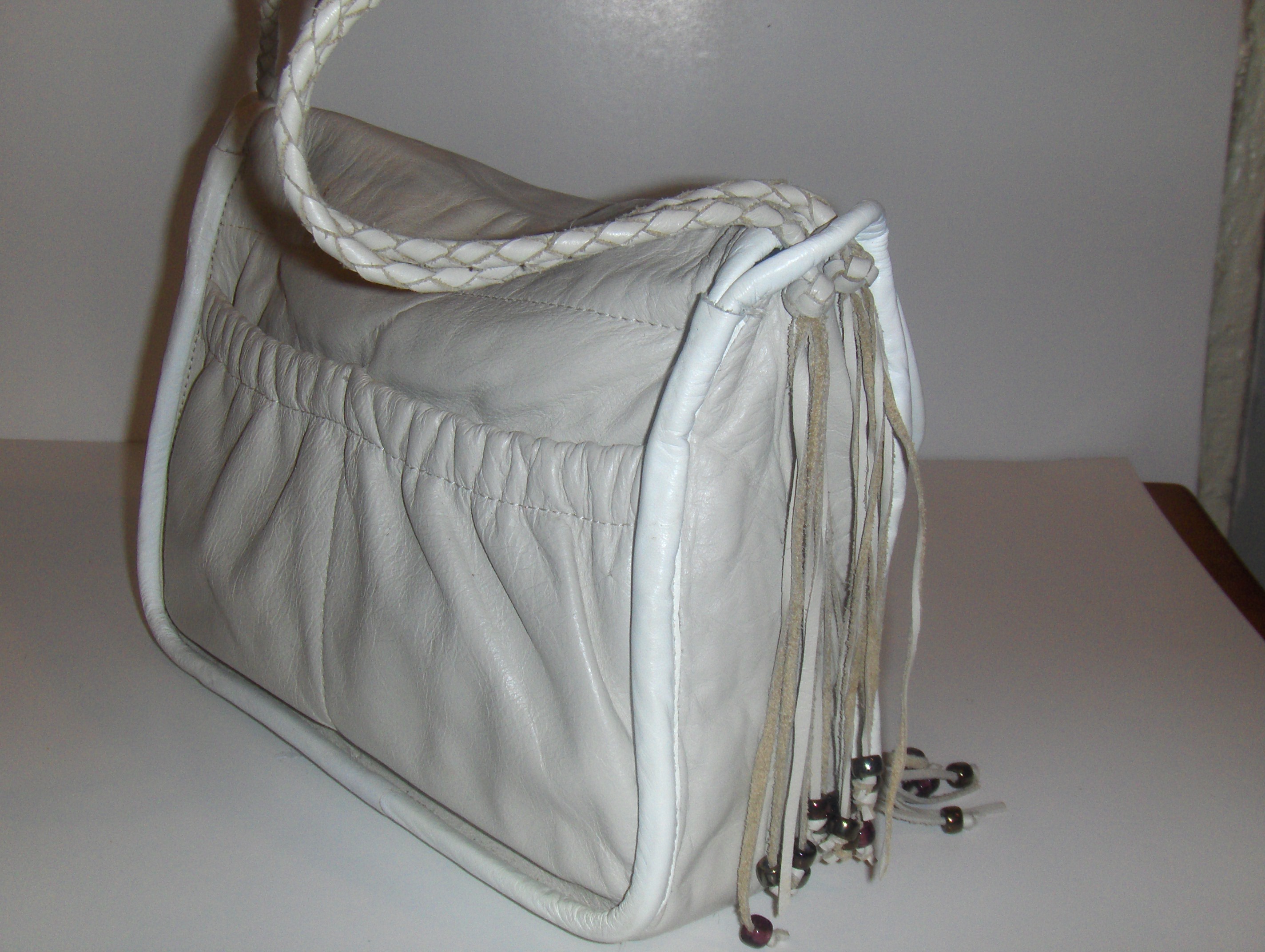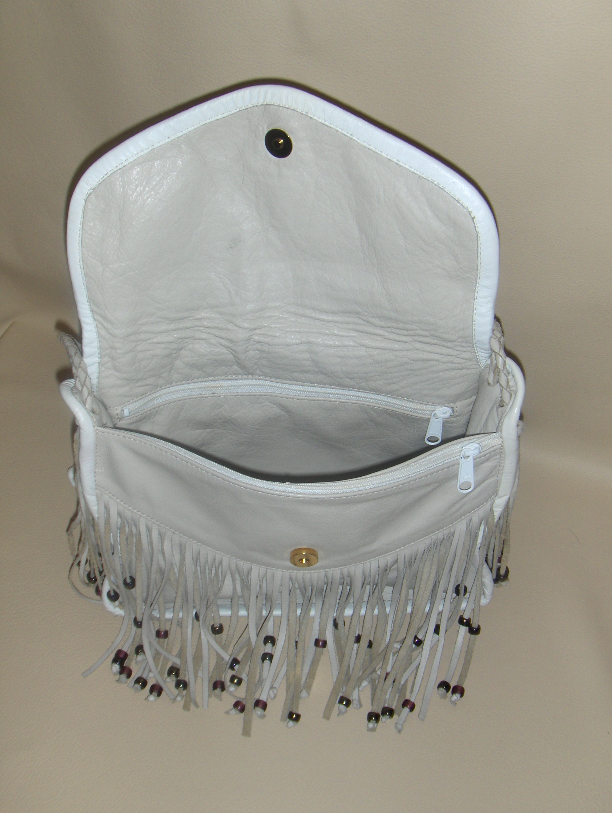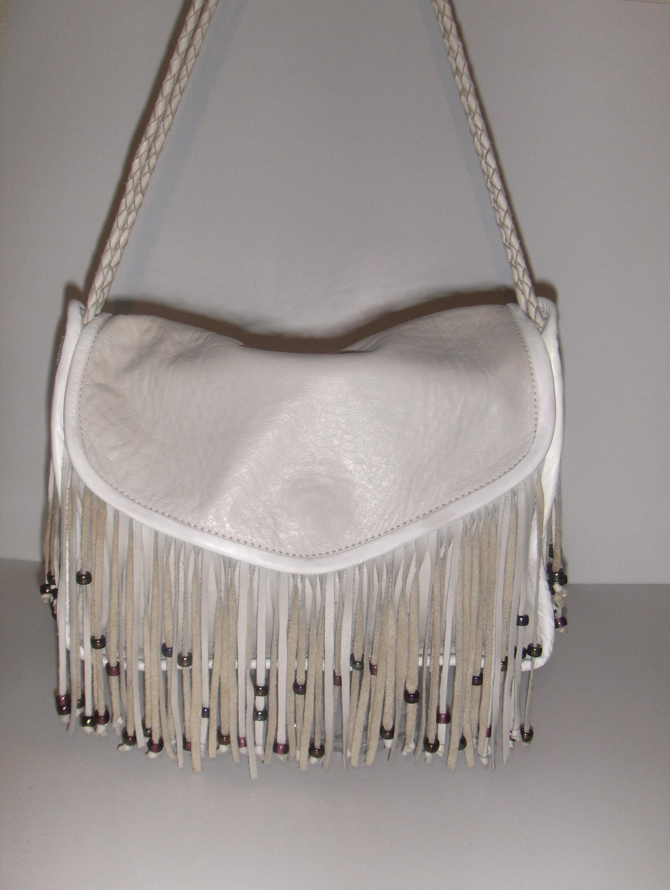 “Ebony and Ivory” large fringed Bag with Beads. Cream with white trim. Choose any color combination along with colored beads or metal. Measuring 11” W x 7” H x 3 ˝” Deep.