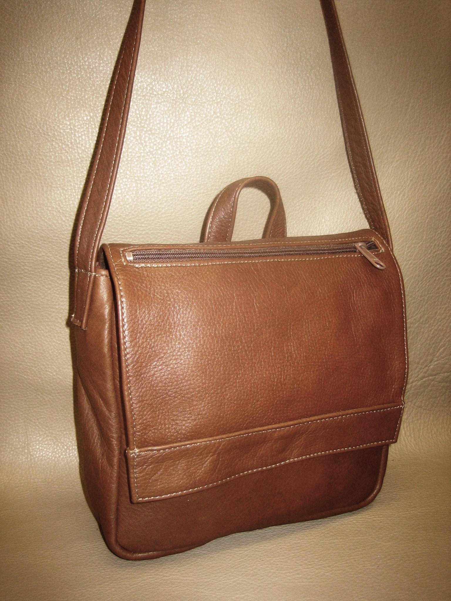 Pocket Flap Bag $160.00 9”wide x 9” long x 2 ˝” thick Average sized bag perfect for everyday use with several leather pockets. Front flap zipper pocket, full back pocket, and inside zipper pocket.