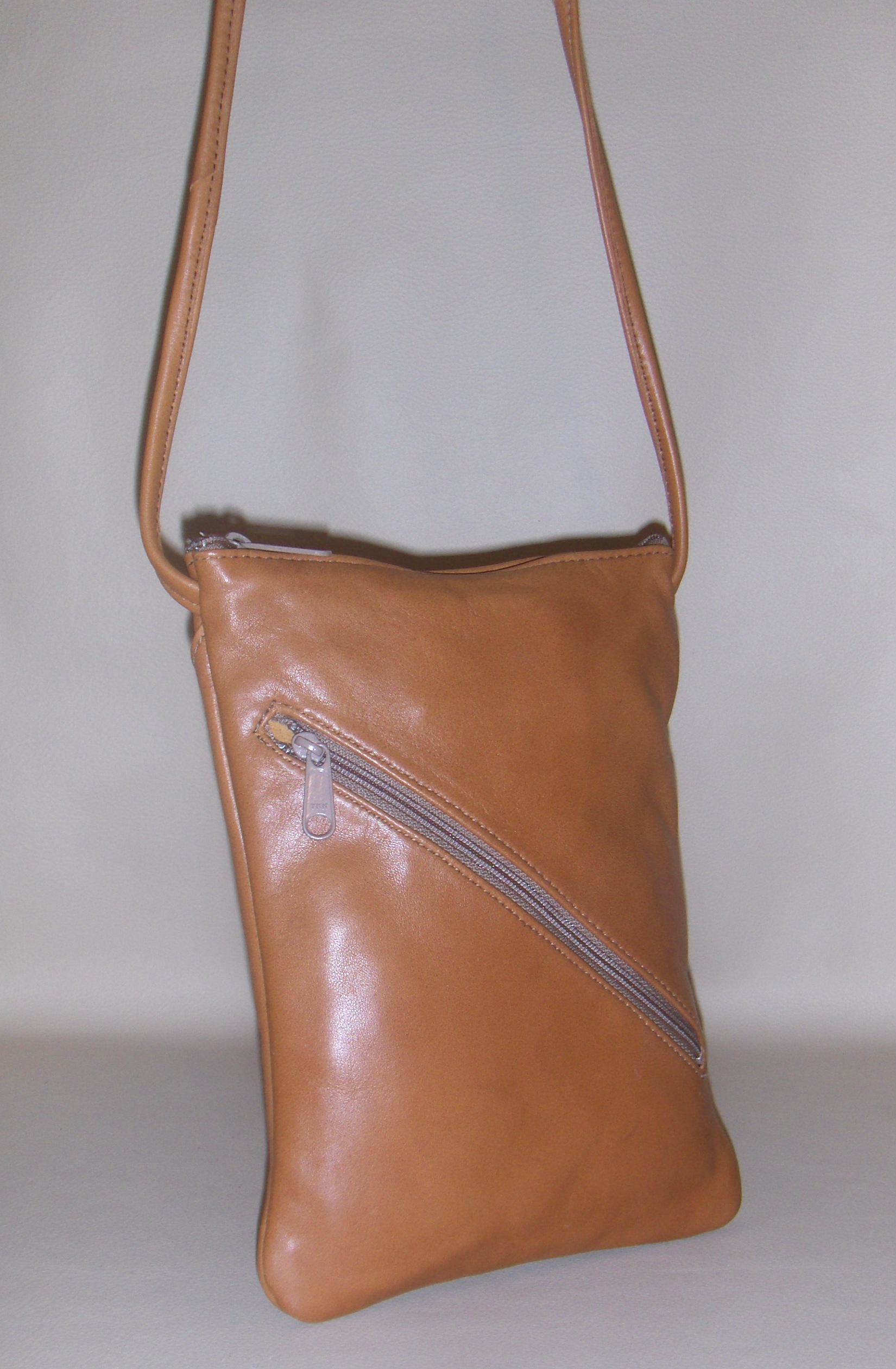 Top zipper closure, features slant zip pocket front and open back pocket. 7 1/2" W x 9 1/2" Long. Strap is easily adjustable from the inside of the bag.