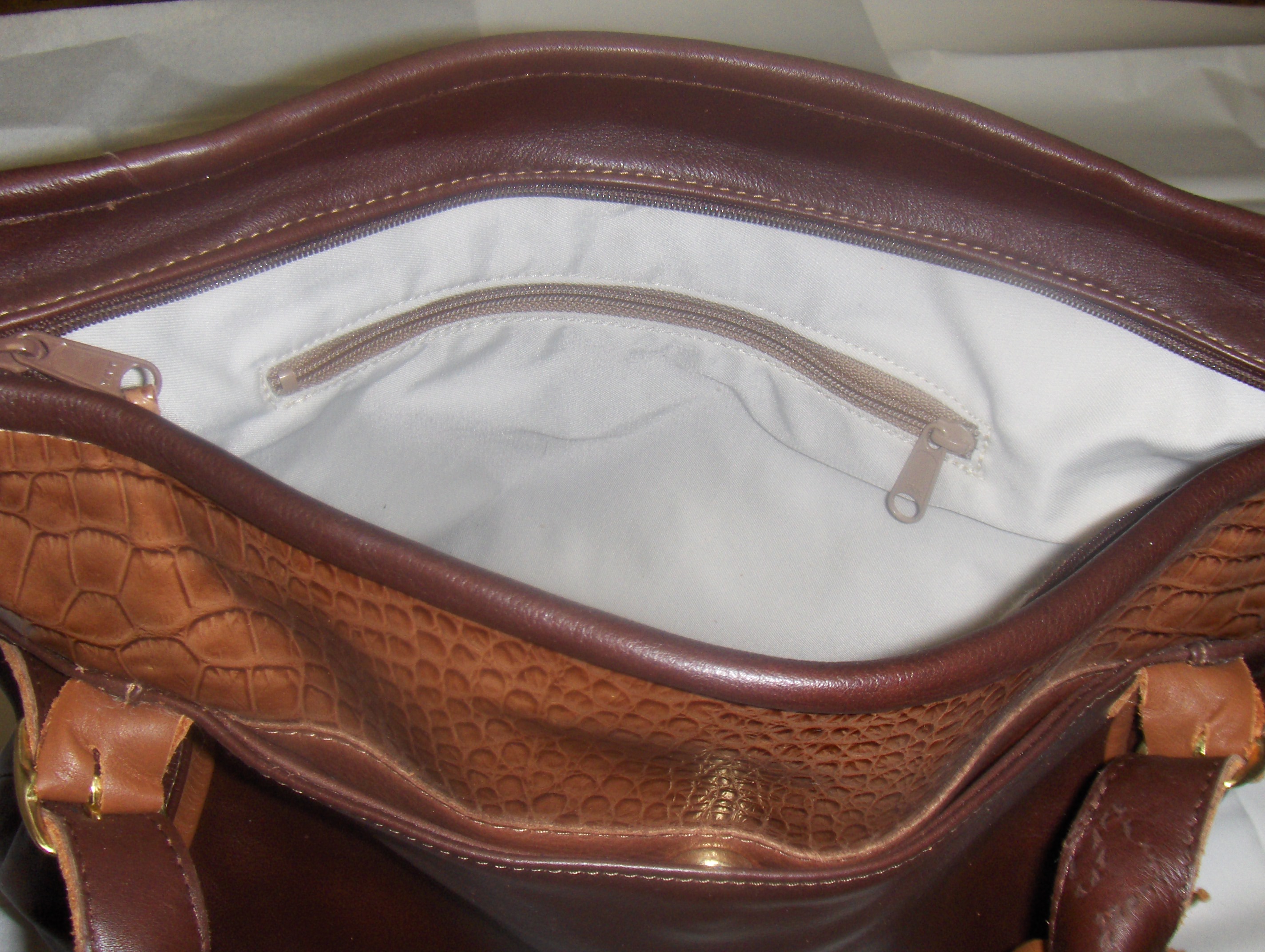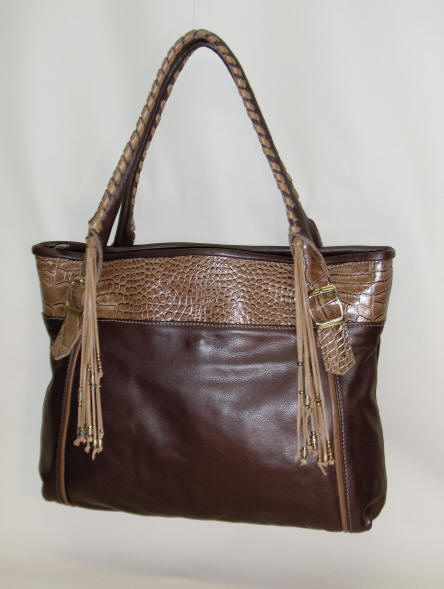 Large bag featuring embossed leather along with complimentary colors, buckled handles with beaded fringe in front.  Can be made in Brown, Black or Red.    14” Long x 10 ½” High x 3 ½” Bottom. The front has a 9” zipper pocket and a 9” back pocket with a snap closure. The inside is completely lined with an 8” zipper pockets on each side, along with a cell phone pocket.